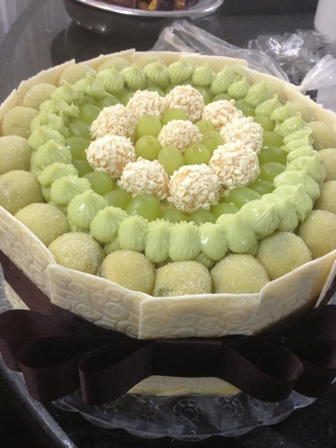 A decoração você está vendo que é super caprichada com doces de uva, mais gomos de uva verde, além das placas de chocolate envolvendo todo o bolo que são divinas e fazem toda a diferença!!!Esse é mais um dos bolos que com certeza é garantia de sucesso da Peccato, e que você pode fazer já a sua encomenda através do telefone!!